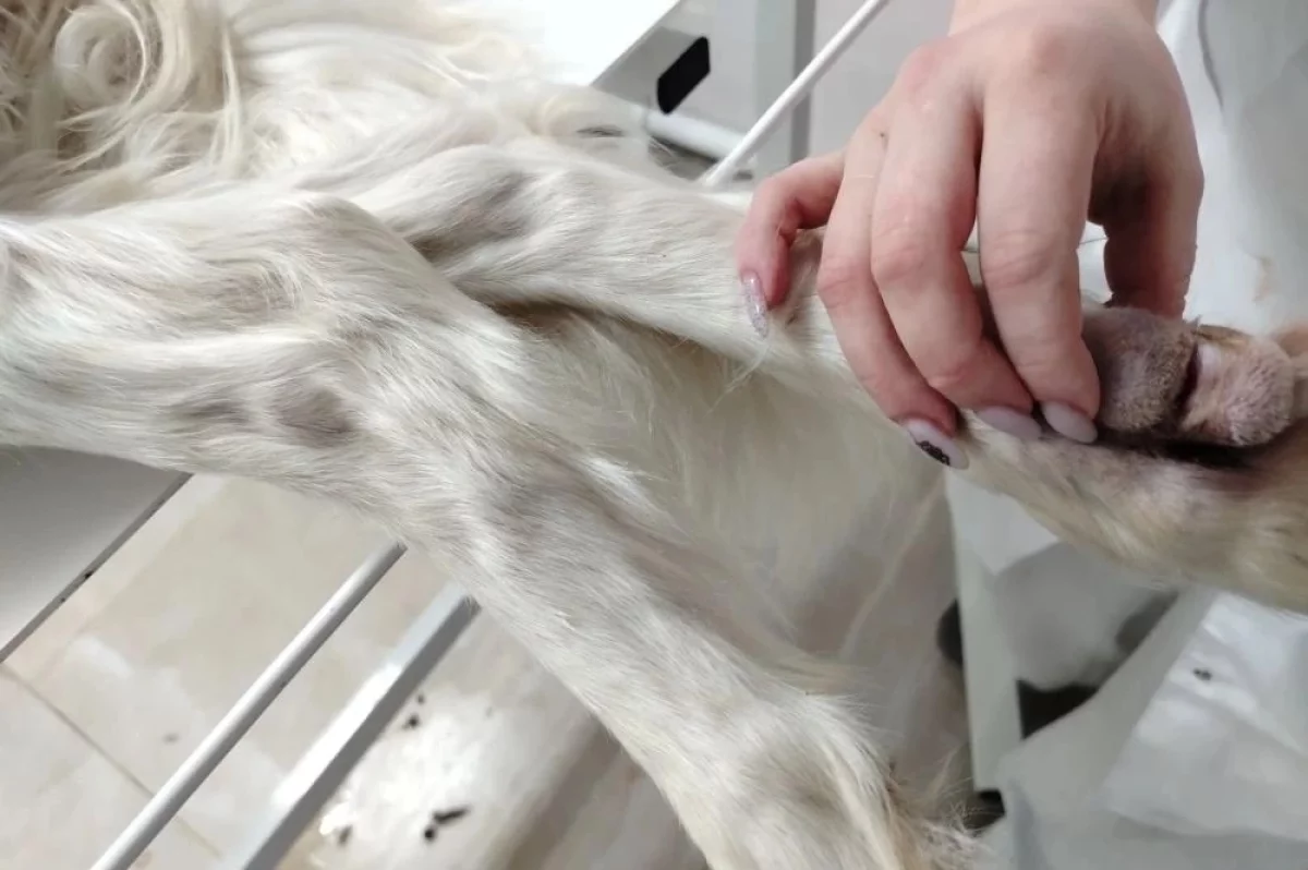 Специалисты ОГУ «Александрово-Гайской райСББЖ» обнаружили у охотничьей собаки разрыв межпальцевой области лапы.