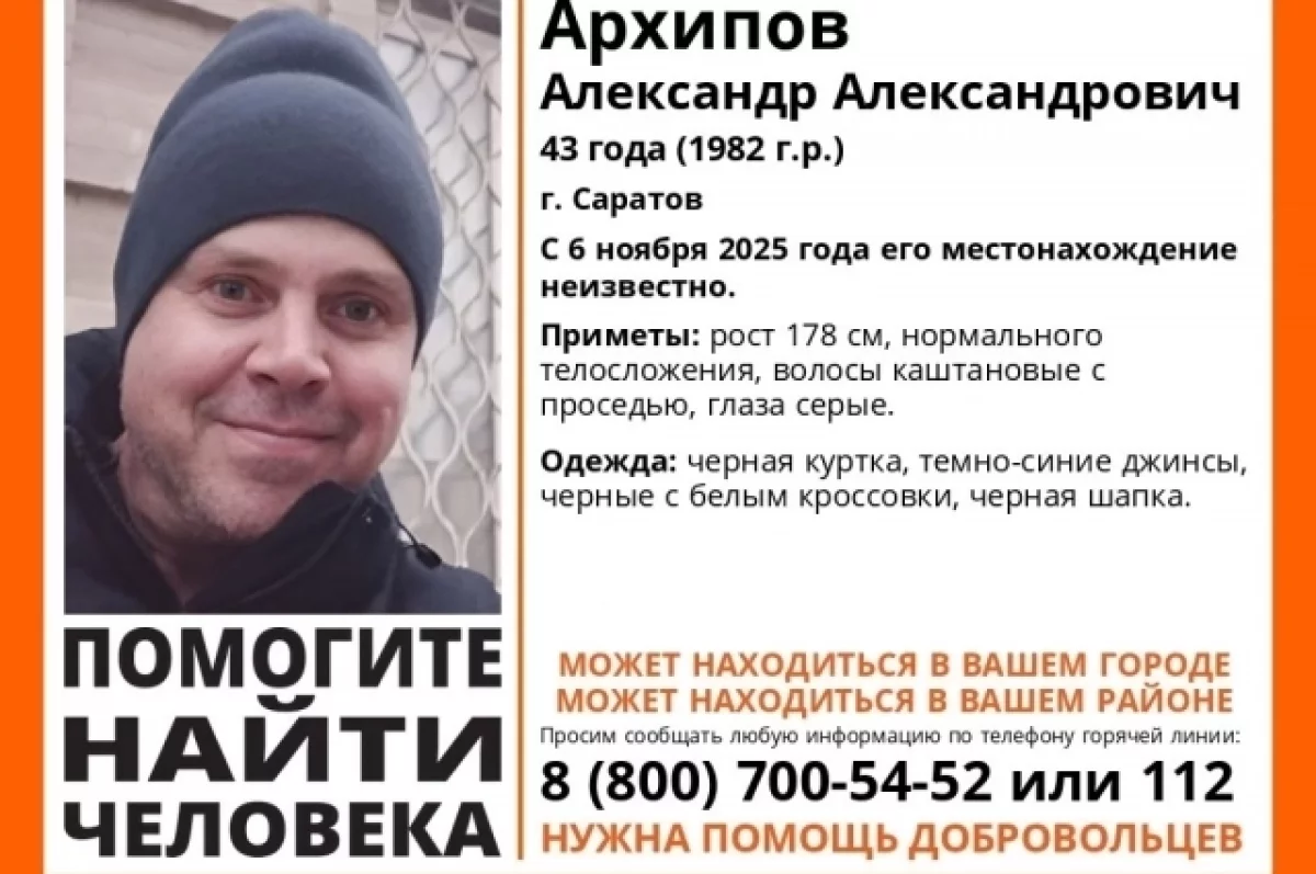 Как сообщает поисковый отряд «ЛизаАлерт», о местонахождении мужчины ничего не известно с 6 ноября 2025 года. На момент пропажи он был одет в черную куртку, темно-синие джинсы, черные с белым кроссовки и черную шапку.