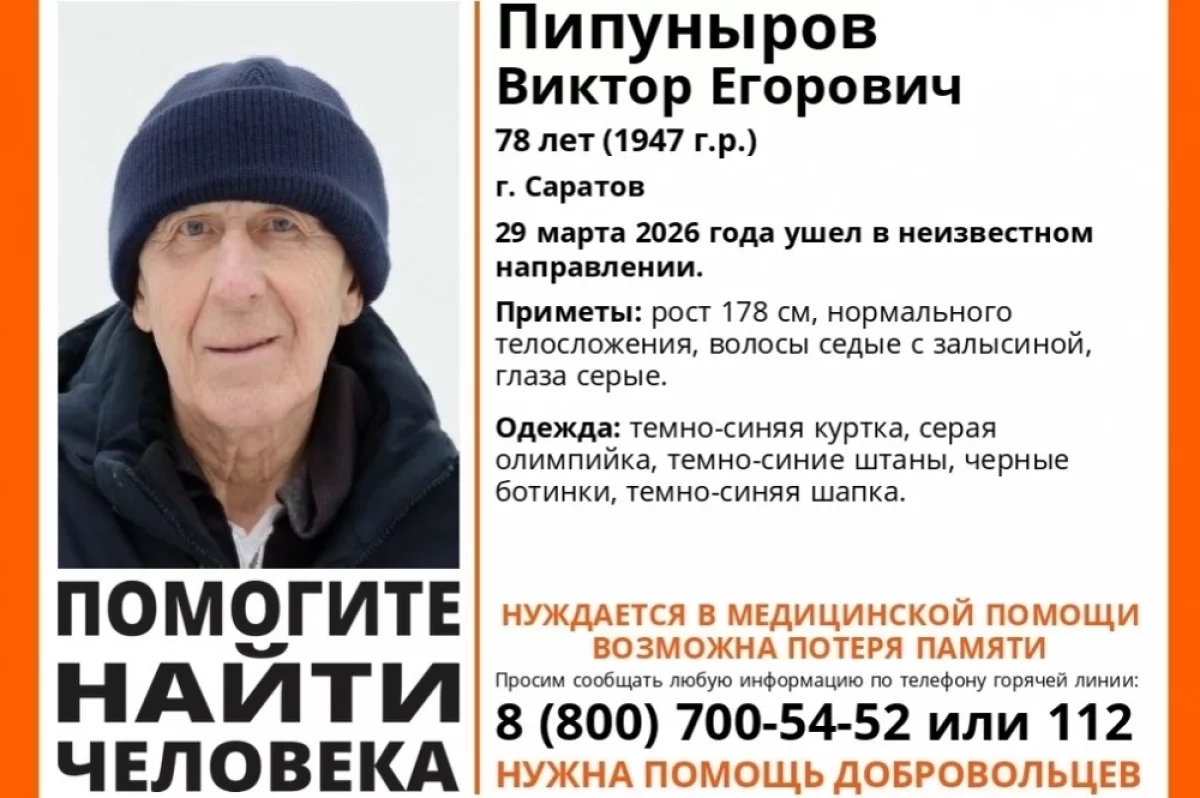 По данным волонтеров поискового отряда «Лиза Алерт», Виктор Пипуныров пропал 29 марта 2026 года в темно-синей куртке с капюшоном, серой олимпийке, темно-синих штанах, черных ботинках и темно-синей вязанной шапке.