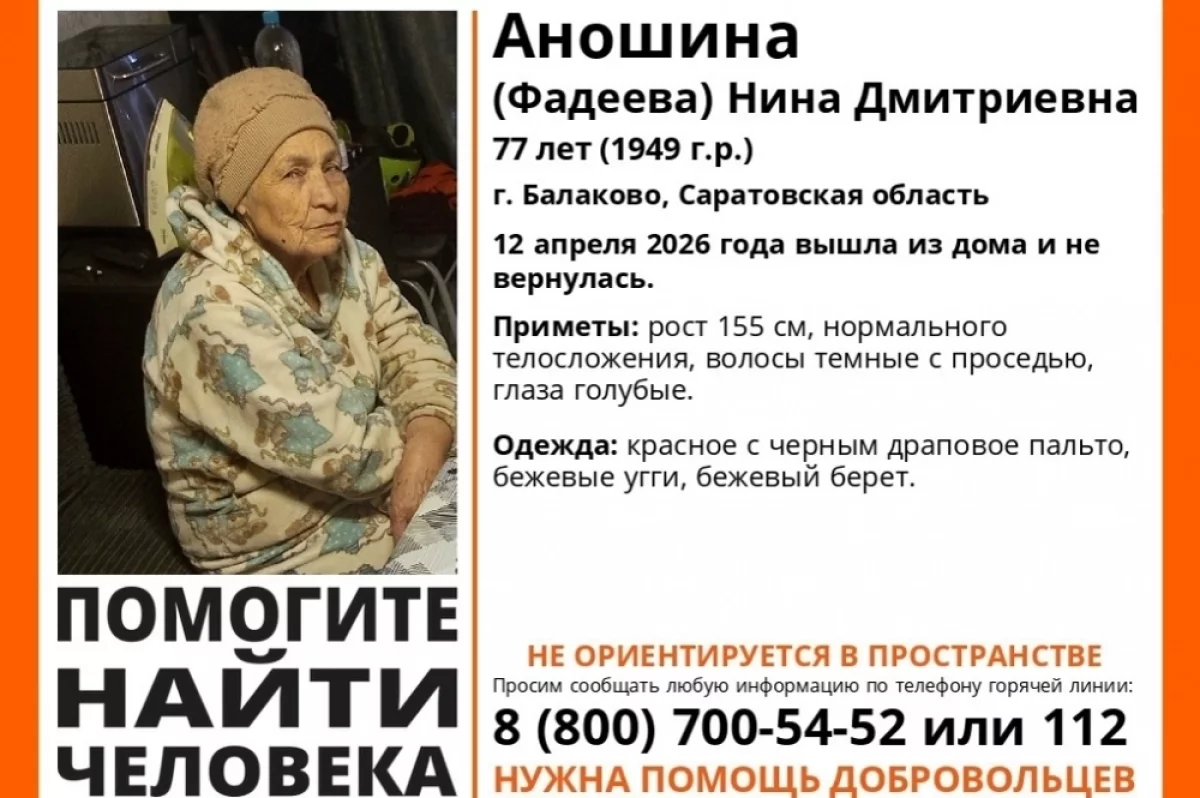 Волонтеры поискового отряда «Лиза Алерт» сообщили, что пенсионерка пропала 12 апреля 2026 года в красном с черным драповом пальто, бежевых уггах и берете.