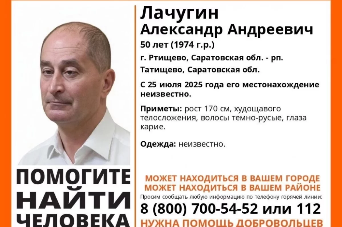 Александр Андреевич Лачугин пропал 25 июля 2025 года, сообщили волонтеры поискового отряда «ЛизаАлерт».