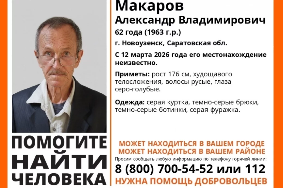 12 марта пропал 62-летний Александр Макаров в Новоузенске. Его видели последний раз в серой куртке, темно-серых брюках и ботинках, серой фуражке. Приметы: рост 176 см, худощавого телосложения, волосы русые, глаза серо-голубые.