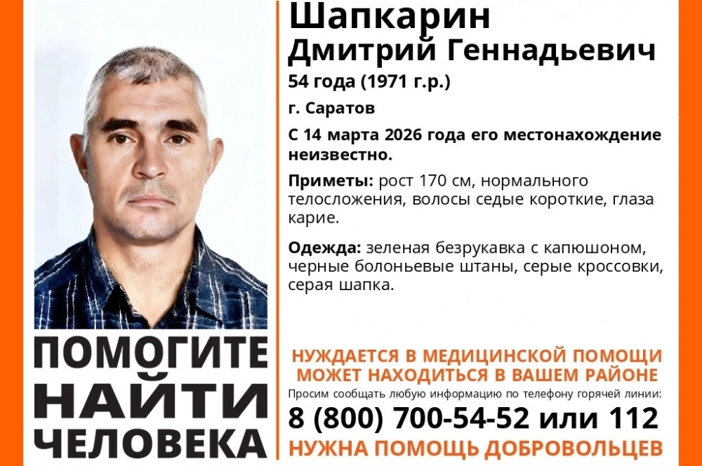 14 марта пропал 54-летний Дмитрий Шапкарин в Саратове. Он был одет в зеленую безрукавку с капюшоном, черные болоньевые штаны, серые кроссовки, серую шапку. Приметы: рост 170 см, нормального телосложения, волосы седые короткие, глаза карие.