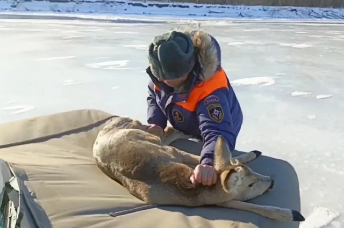 Инспектор ГИМС Олег Филатов на руках эвакуировал на берег животное со льда. Несмотря на сопротивление косули, все завершилось благополучно.