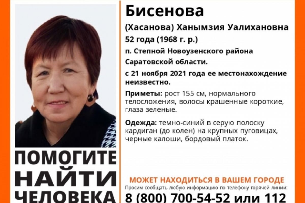 В Саратовской области ищут пропавшую 52-летнюю Ханымзию Бисенову.