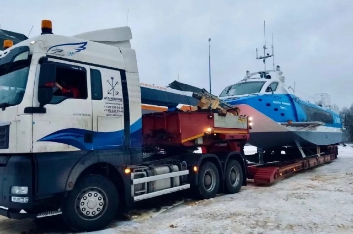 Судно на подводных крыльях везут с помощью грузовика из Нижегородской области.