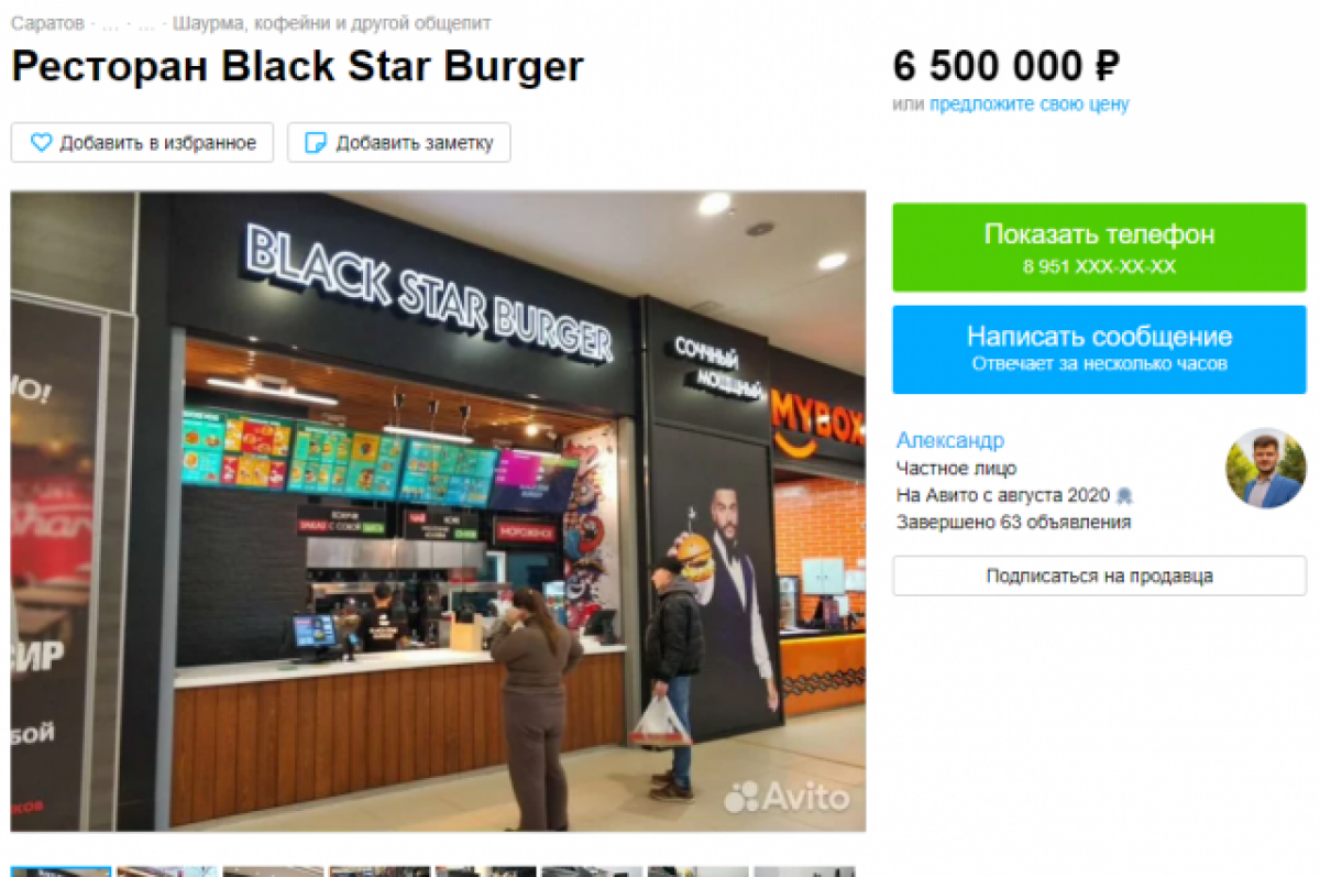 В Саратове продается ресторан «Black Star Burger», расположенный на фудкортах в Триумф Молле. Готовый бизнес выставлен на продажу на сайте бесплатных объявлений.